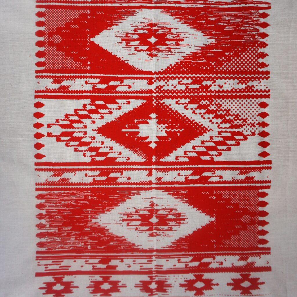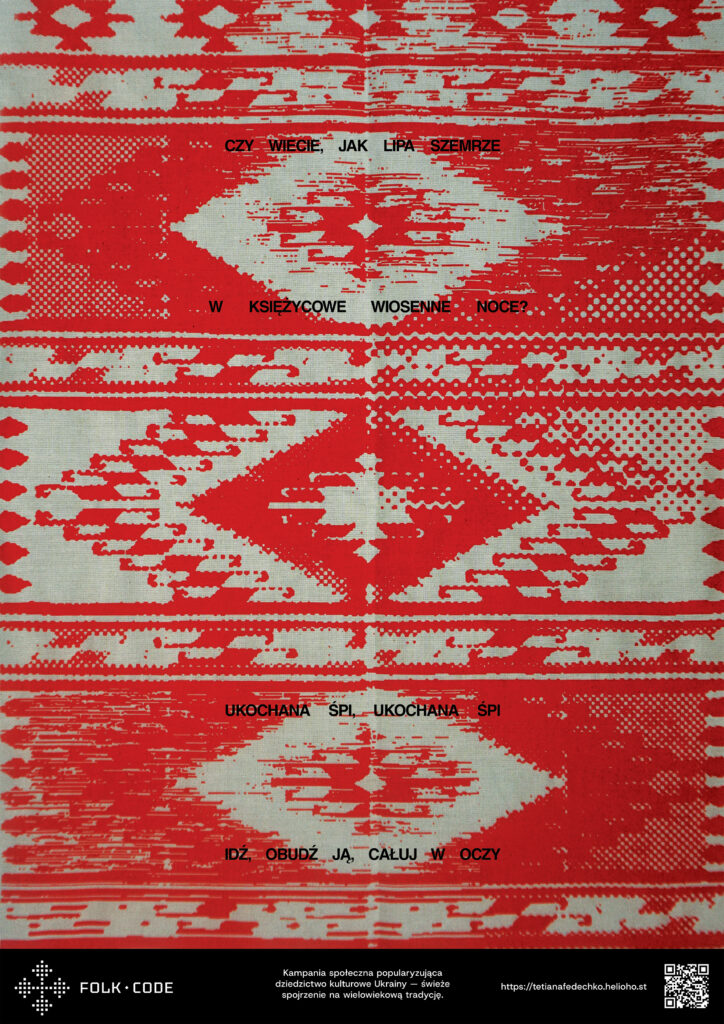 Plakat „TKANY SEN” od razu kojarzy się z dywanem. Dawno temu dywany były wieszane na ścianach, a teraz zamiast nich można po prostu powiesić plakat. Inspiracją dla tej pracy był dywan huculski. Ornament wydrukowałam techniką sitodruku na bawełnianej tkaninie, a następnie zeskanowałam obraz. Dodatkową ozdobą stały się wersy z wiersza Pavla Tychyny „Czy wiesz jak lipa szemrze…”.